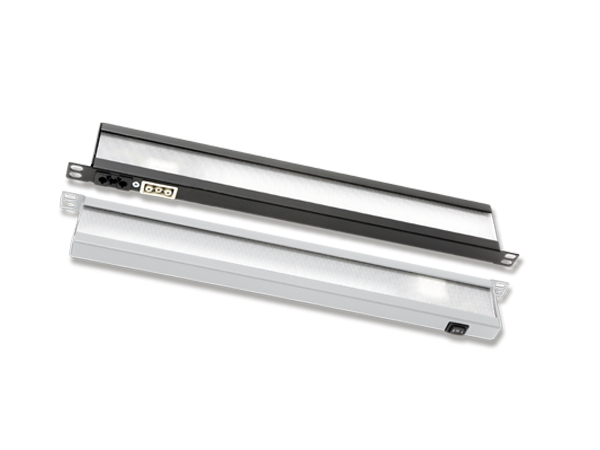 Durch die optimierte Prismenoptik werden die Rack-Einschübe bestmöglich beleuchtet. Vorteilhaft sind die geringe Bauhöhe von nur einer halben Höheneinheit und die Einbaumaße von 482 x 62 x 22 mm.
