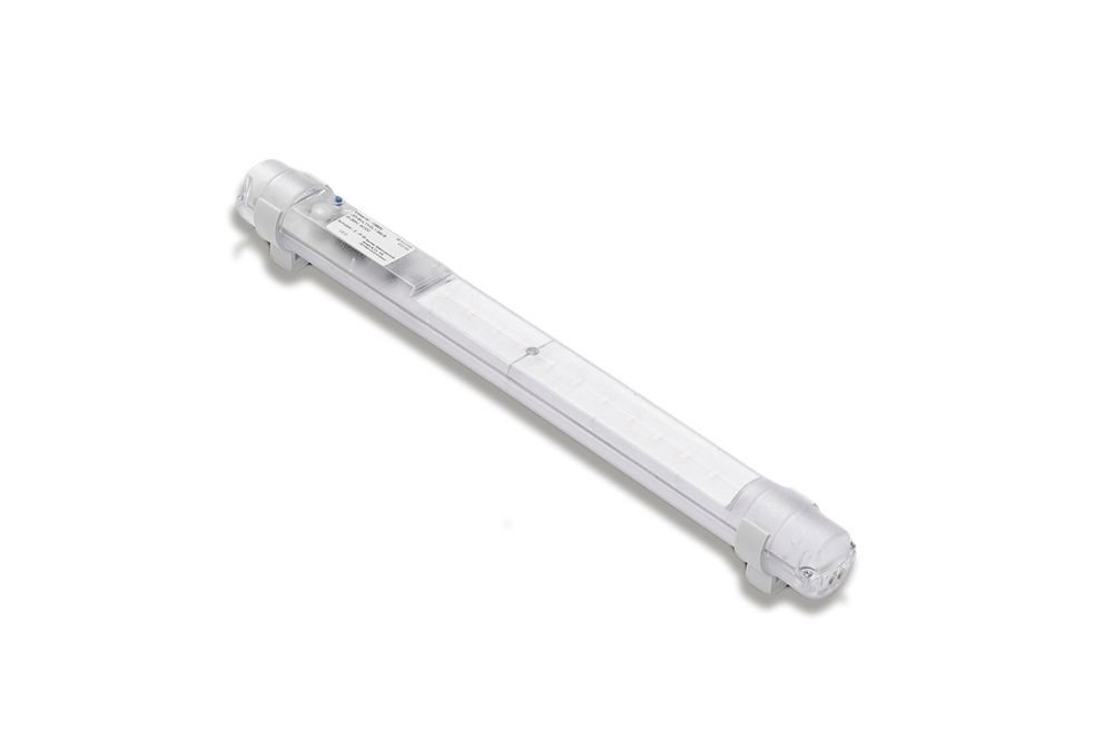 Die staub- und spritzwasser geschützte LED-Maschinenleuchte hat ein Gehäuse aus transparentem Poycarbonat und eine Schutzabdeckung der Platine aus Acrylglas. Seitlich fest angeschlossen ist ein 2 m langes Netzkabel in grau. Mit zwei variablen Rohrschellen kann die Leuchte befestigt werden. Sie ist in drei verschiedenen Längen sowie in verschiedenen Spannungen (auch in UL-Ausführung) erhältlich. Die Leuchten der LED-W-Serie erfüllen die Schutzart IP54.