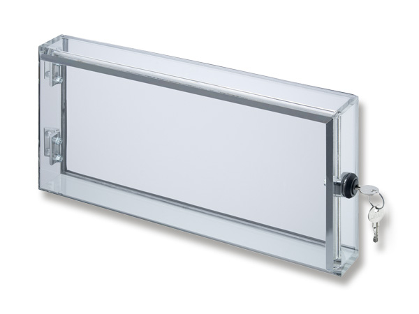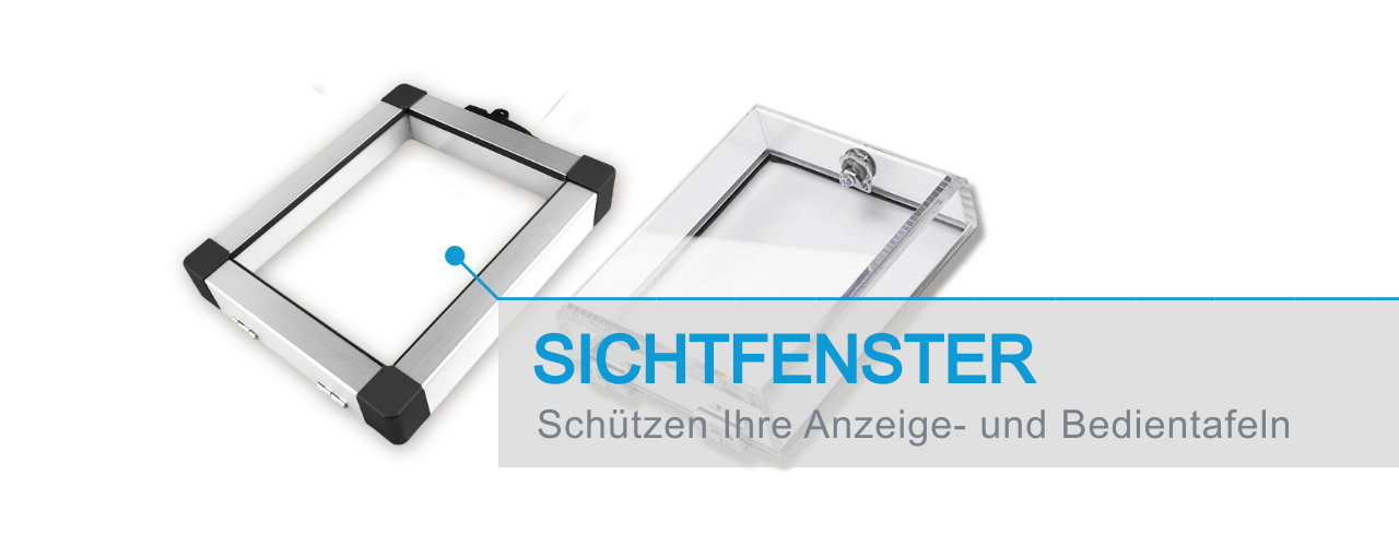 Das SRC Sichtfenster besteht aus einem eloxierten Aluminiumrahmenprofil und einer 2,5 mm starken Scheibe aus Acrylglas. Die Rahmentiefe des Fensters beträgt 55 mm, die Aufbauhöhe für Komponenten 48 mm. Der Öffnungswinkel beträgt 90 Grad. Standardmäßig ist das Fenster mit der Schutzart IP42 ausgestattet. IP54 ist gegen Aufpreis möglich. Das Sichtfenster wird mit einem Zylindervorreiber inklusive zwei Schlüsseln geliefert. Alternativ ist eine Ausführung mit Magnetverschluss oder Schwenkhebel zur Aufnahme eines kundeneigenen Profilhalbzylinders möglich. Für den Einsatz in der Lebensmittelindustrie sind Edelstahlscharniere in Verbindung mit einem Kunststoffschloss erhältlich. Aufgrund der Beschaffenheit des Aluminium-Profils befinden sich sowohl die Scharniere als auch die Schließung des Fensters innerhalb des Rahmens, d. h. es liegt nicht im Sichtbereich der Scheibe und stört somit nicht den Bereich der abzudeckenden Komponenten. Die Auswahl des richtigen Verschlusses ist abhängig von den individuellen Anforderungen des Kunden. Manchmal ist das Handling des Sichtfensters mit Schloss und Schlüssel schwierig, wenn z. B. Handschuhe getragen werden. Dann kann alternativ ein Magnetverschluss verbaut werden. Der Schwenkhebel wiederum eignet sich zur Aufnahme eines kundeneigenen Profilhalbzylinders. In der Lebensmittelindustrie werden häufig Edelstahlscharniere in Verbindung mit einem Knebeldrehriegel aus Kunststoff ohne Schloss bevorzugt. Die Herstellung bei uns im eigenen Betrieb ermöglicht die zeitnahe Umsetzung der Kundenwünsche sowie kurzfristige Lieferzeiten.
